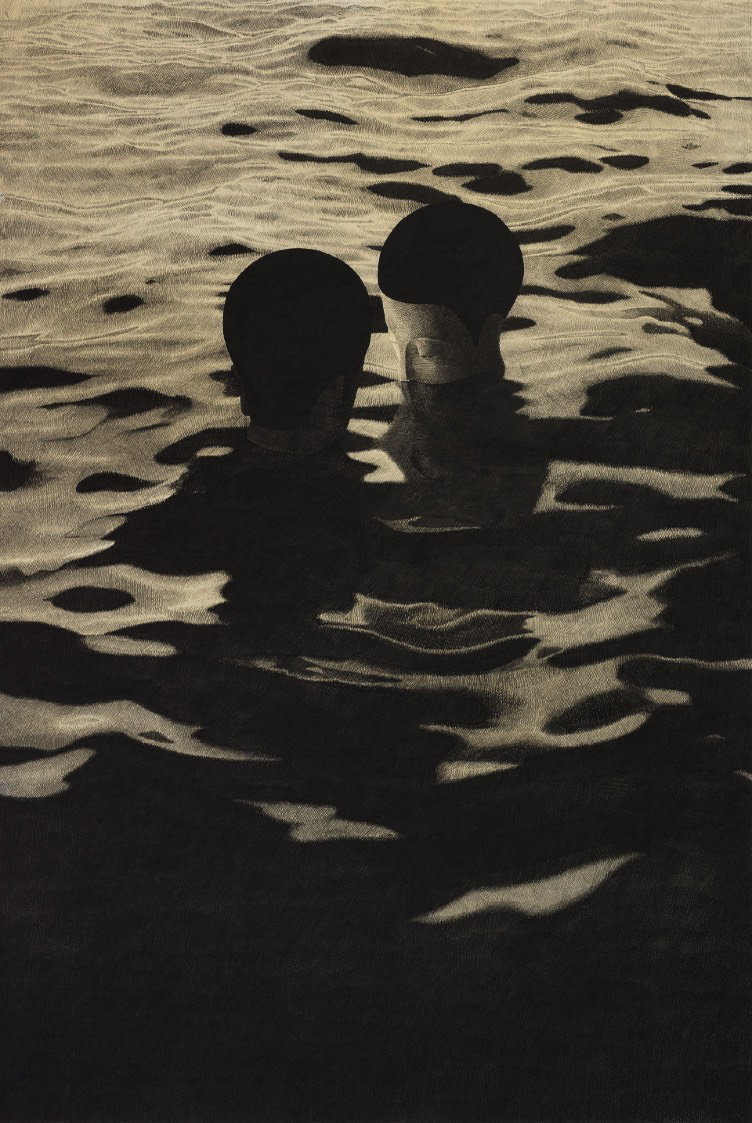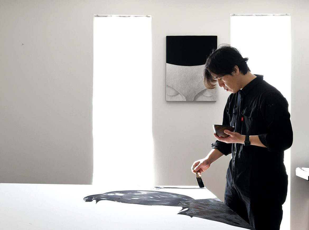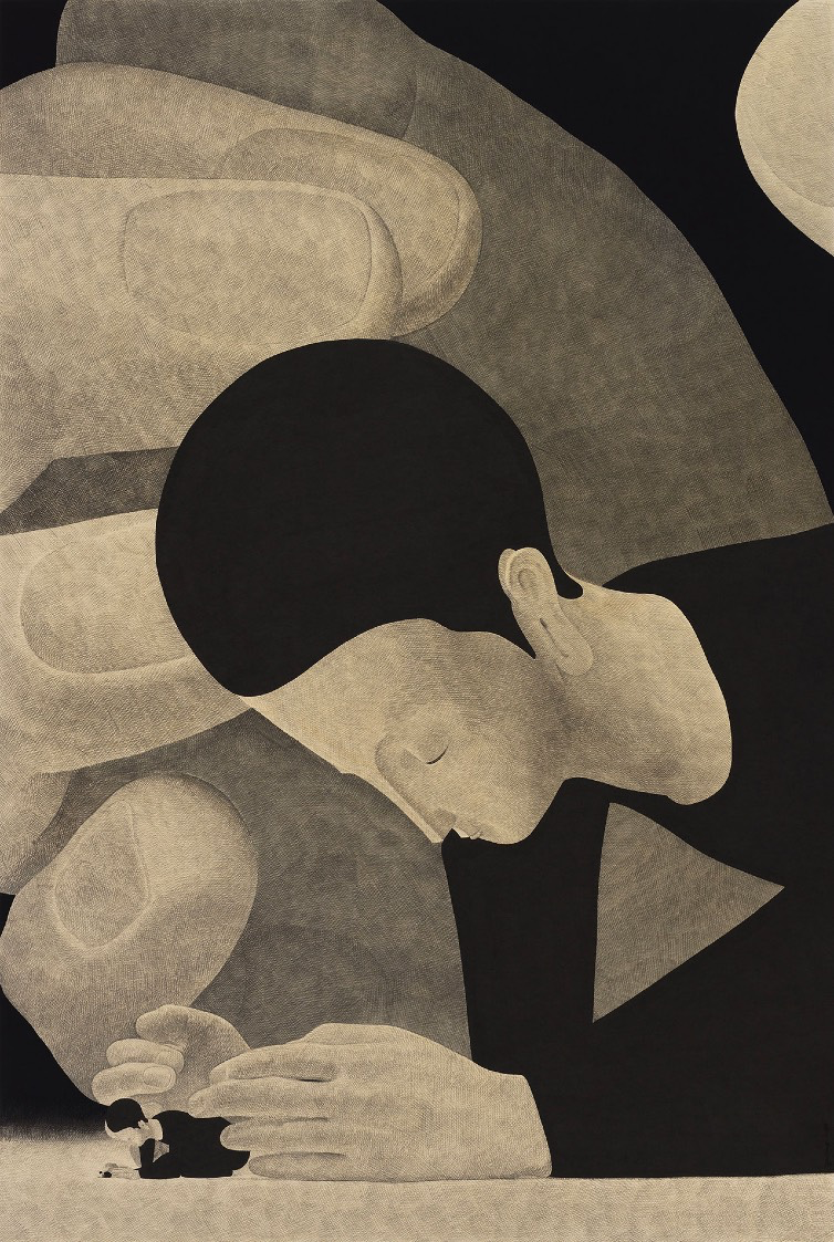Moonassi explores the complexities of human relationships. Using a restrained palette of black and white, he combines traditional Meok (ink) with acrylic on Korean paper, emphasizing simplicity and introspection.