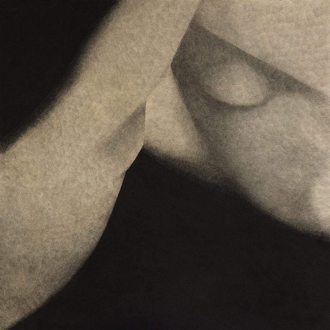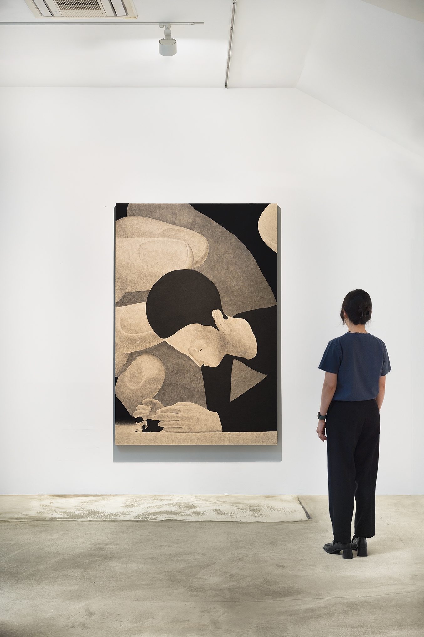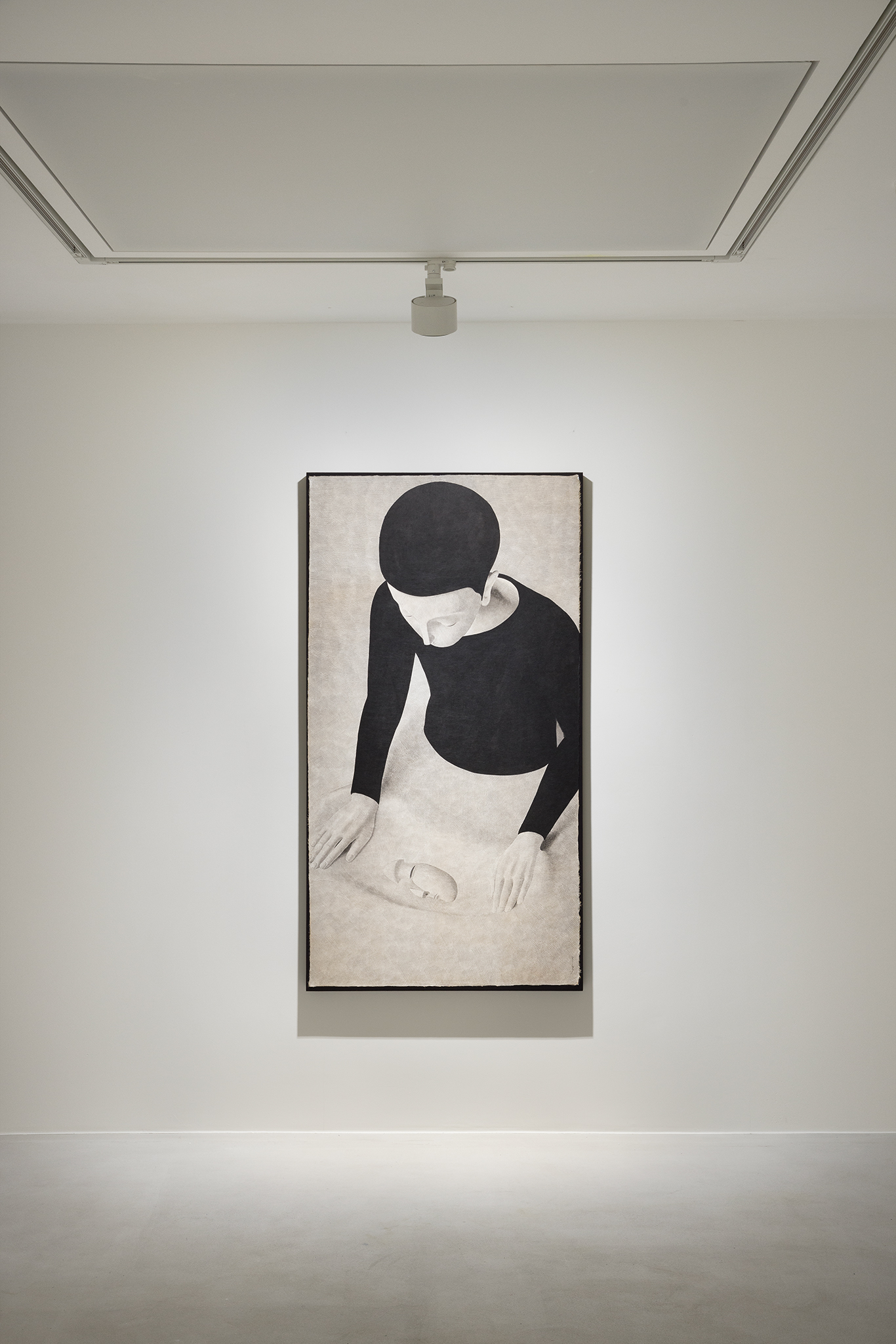 Moonassi explores the complexities of human relationships. Using a restrained palette of black and white, he combines traditional Meok (ink) with acrylic on Korean paper, emphasizing simplicity and introspection.