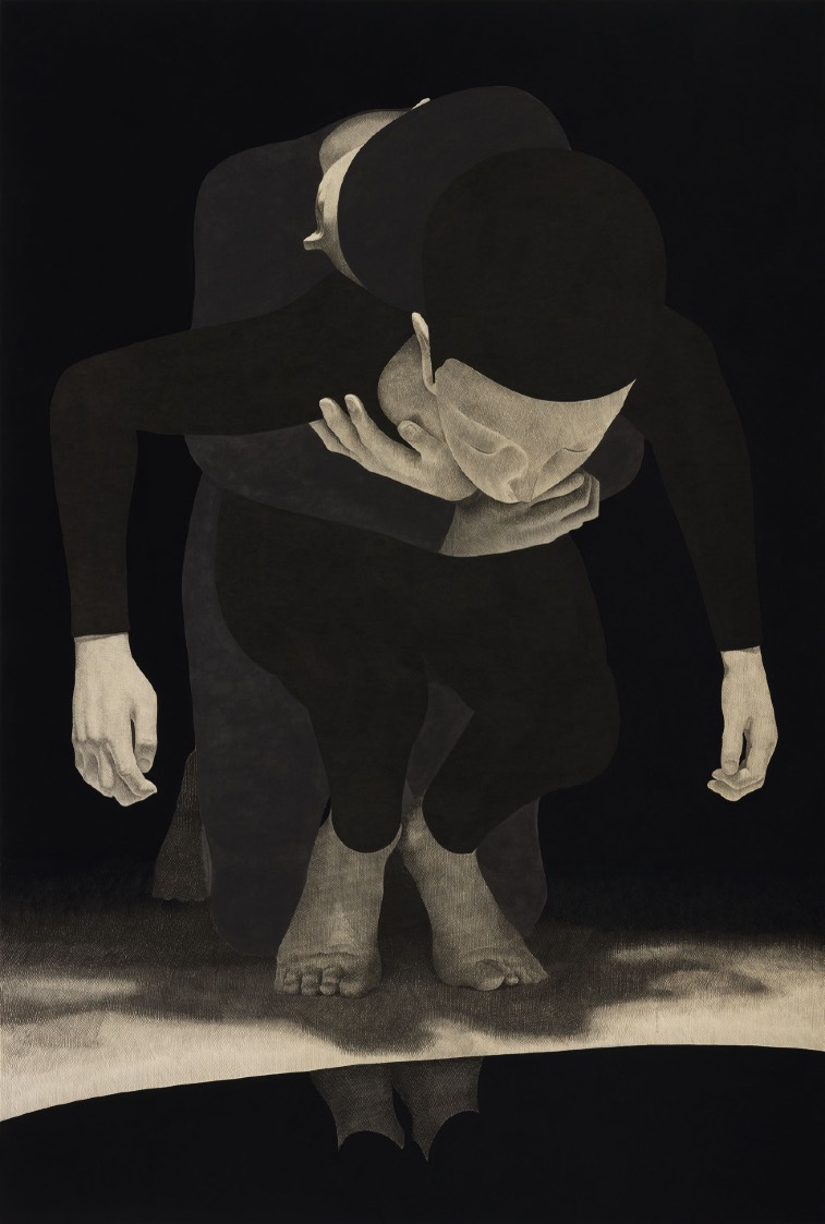 The dark backgrounds in his works often depicted as lakes, crevices, or abstract spaces create a surreal and dreamlike atmosphere, evoking an infinite inner landscape. Rather than limiting his artistic expression, the absence of color becomes a means of liberation, allowing viewers to engage more deeply with the essence of each piece.